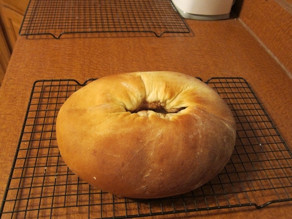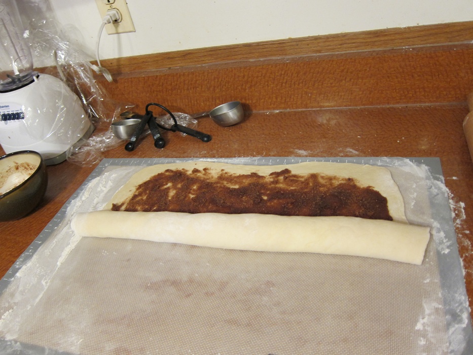 When the dough has risen, knock it down and turn it out on a lightly floured surface. Roll it out into a 18X14″ rectangle. Spread the filling evenly over the dough, leaving a 1″ border free on all sides. Roll up like a jellyroll.