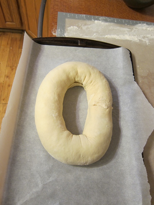 Pinch the seams shut and carefully move to the prepared sheet, placing seam-side down and curling into a ring. Lightly moisten the ends and press them together to seal.