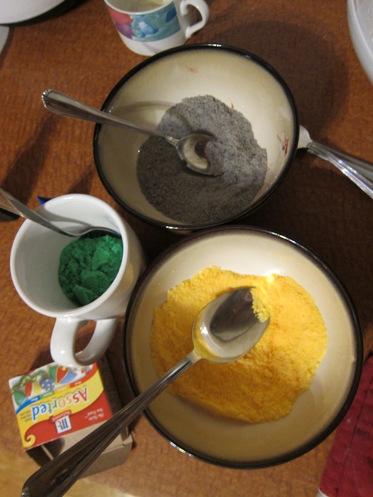 While the cake cools, prepare the colored sugar, then the glaze. For the sugar, put each 1/3 cup of sugar into a separate cup or bowl. Add several drops of green food coloring to one, yellow to another, and red and blue to a third. Mix in, grinding with the back of a spoon until evenly colored.