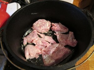 Heat a deep, ovenproof dish about a foot in diameter with a bit of olive oil and the knob of butter in the bottom, over medium-high heat. Coat the rabbit pieces in flour and shake off any excess. Put half the rabbit pieces in the pot and cook about 5 minutes until golden all over.