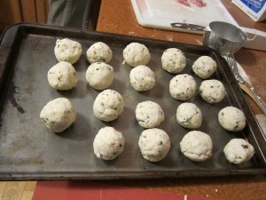 Knead together, then roll into a large snake. Cut into 18 equal sized pieces and roll into balls. Place on a sheet, and sprinkle nutmeg over the top. (We skipped that, as I’m pretty anti-nutmeg.) Move the tray to the fridge.