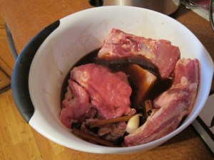 Cut the slab of ribs into smaller portions, about 3 ribs per piece. Put them in the spice mixture and turn to coat.