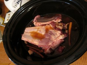 Cut the slab of ribs into smaller portions, about 3 ribs per piece. Put them in the spice mixture and turn to coat. Pour into a crock pot.