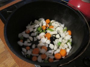 Place a large dutch oven over medium heat (or high, if it’s a really heavy cast iron oven), and add the olive oil, heating until the oil shimmers. Add the onion, carrot, and celery and cook for 5 minutes or until the onion is softened.