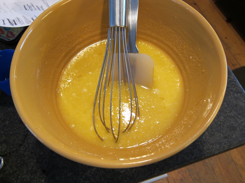 While waiting, make the filling. Whisk the eggs together, then add the sugar, lemon juice, remaining 4 tablespoons of flour, and the baking powder and mix.