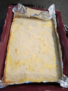 Transfer carefully back to the oven – if you tilt it the flour mixture on top will all shift to the far side. Bake 20-25 minutes, until the new top is golden. Let cool completely in pan.