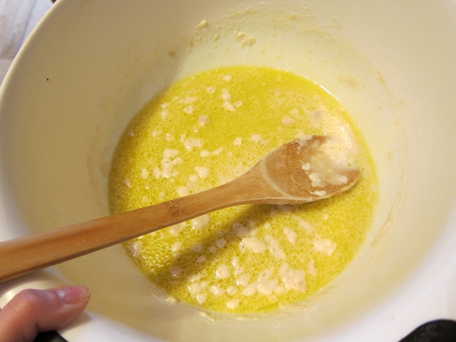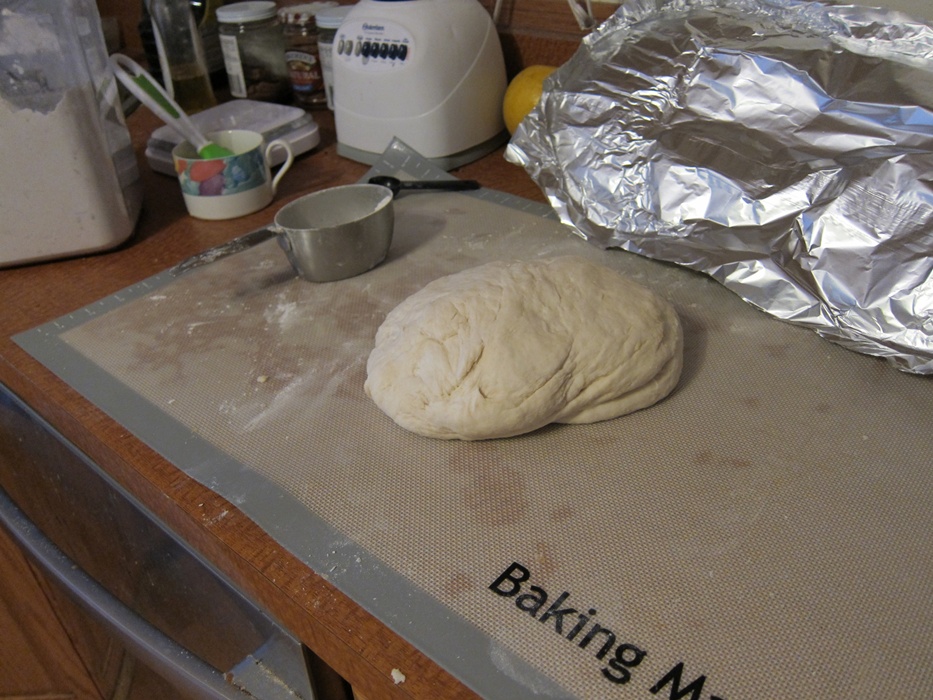 Sprinkle the remaining half cup of flour on a clean surface and turn out the dough to knead. Knead for 3-4 minutes, then stop to clean, dry, and grease your bowl. Knead several more minutes, until smooth and springy, then form into a ball. Put the dough into the ball and turn to grease all over. Cover and let rise somewhere warm and draft-free for an hour, or refrigerate for several hours.