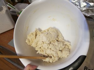 Add the next 4 1/2 cups flour, stirring together until the dough holds mostly together in one big lump.
