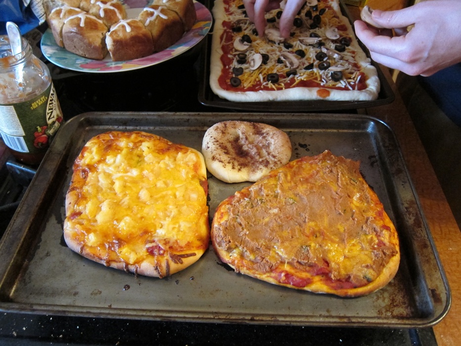 When ready to eat, preheat the oven to 475 degrees. Roll out the dough, stopping to let it rest 2 minutes if it keeps shrinking back. Decorate your pizza as desired. Bake the pizza 15-20 minutes, until the cheese is melted and the crust is golden brown.