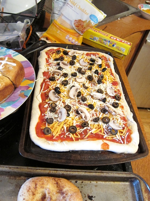 When ready to eat, preheat the oven to 475 degrees. Roll out the dough, stopping to let it rest 2 minutes if it keeps shrinking back. Decorate your pizza as desired.