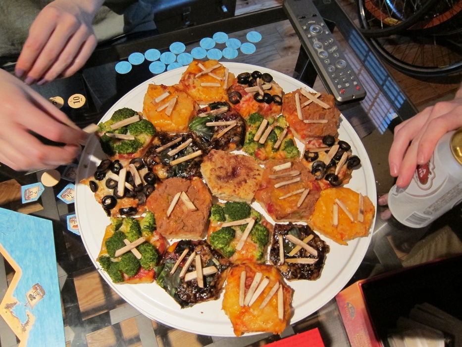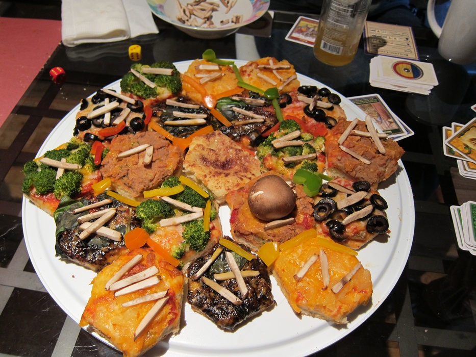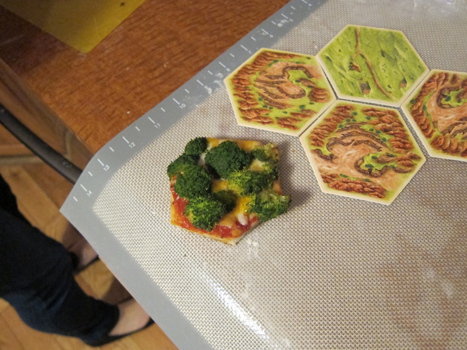 Last weekend we played Settlers of Catan. The exciting, relevant part of this is, that we played it with food! This pizza dough was the base of our board pieces.