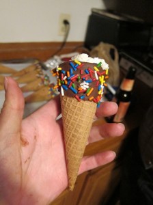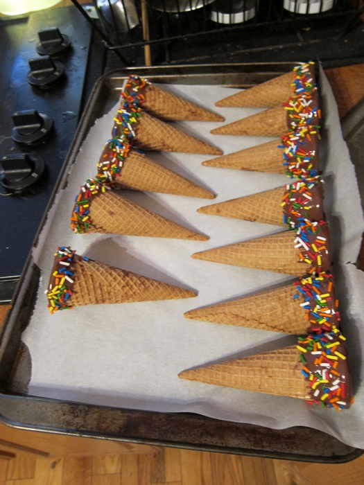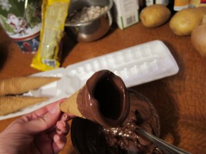 When ready to eat, melt the chocolate in a double boiler or carefully in the microwave. Pour a spoonful of chocolate in the cone, rotate to spread evenly, then turn open-side-down and dip the bottom edge of the cone in the chocolate. Let most of the chocolate run out of the middle of the cone, and shake off the excess.