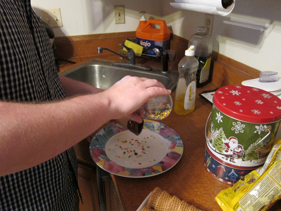 Pour sprinkles on the outside lip of chocolate. Set aside on parchment or wax paper until the chocolate sets.
