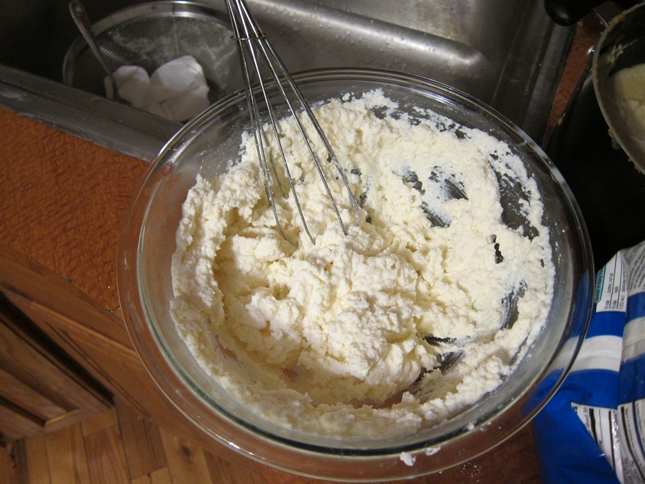 The night before, put the ricotta in a strainer lined with paper towel or cheesecloth. Cover with saran wrap. Change the paper towel 2 or 3 times over the night/following day, squeezing gently to remove excess liquid.