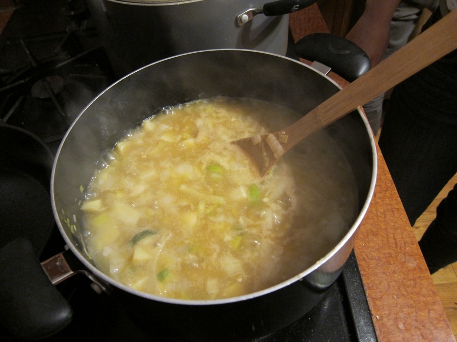 Combine the leeks, and onion and garlic if using fresh, with the margarine in a large pot over medium heat. Season with salt and pepper.