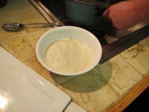 Stir in the dry ingredients, adding the milk if necessary to get all the dry goods incorporated – I think we added just a tiny bit.