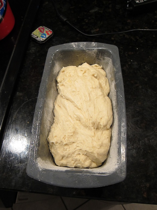While you wait, grease and flour a 9X5″ bread pan. Punch down the risen dough and shape it into a log to fit the bread pan. Cover again, and let rise another half hour.