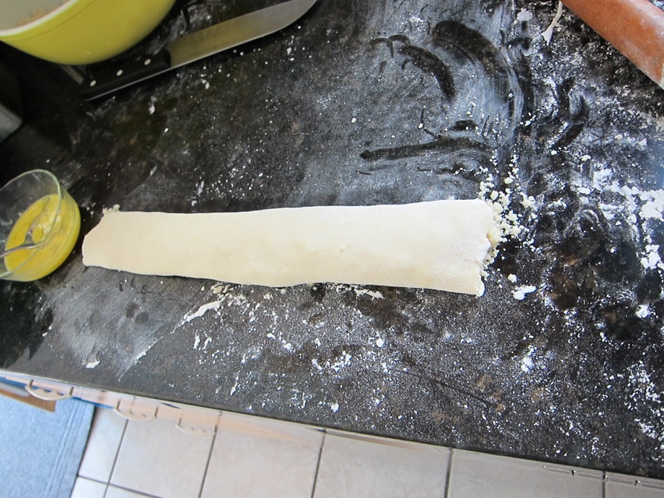 Spread 1/4 of the filling over the dough, going all the way to the sides but leaving a clear space along one long edge. Brush the free long edge with the egg yolk mixture.