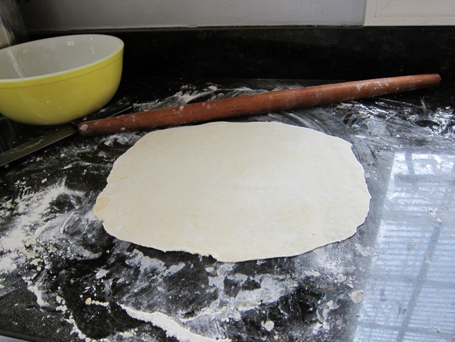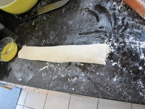 Cut the refrigerated dough into quarters and set 3 aside. Form the first quarter into a ball and roll out on a lightly floured surface. Roll into a large oval or rectangle, about as thin as you can get it before it starts becoming see-through.