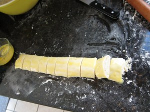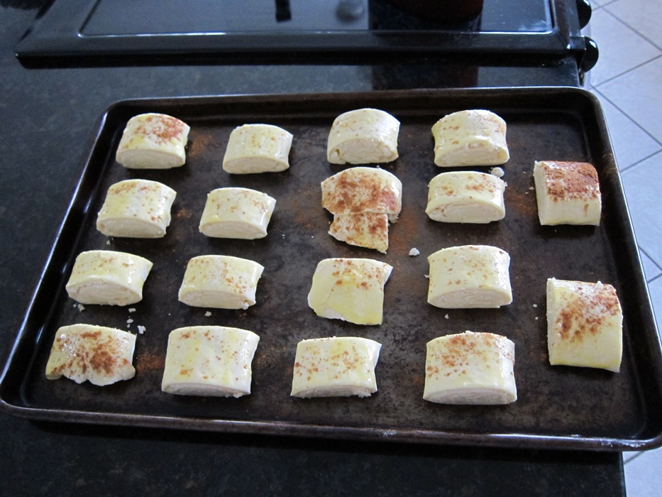 Brush the top of the dough with the egg yolk mixture, then sprinkle with cinnamon and cut into 10 pieces. If you have a crinkle cutter, use that, if not a sharp knife works fine.
