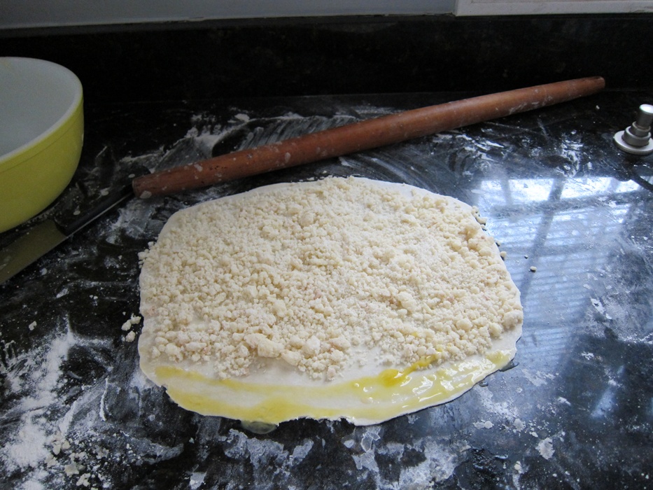 When the dough is read, make the filling by combining all the ingredients in a medium bowl and mixing together with your hands until it looks like damp, lightly clumpy sand. Set aside.