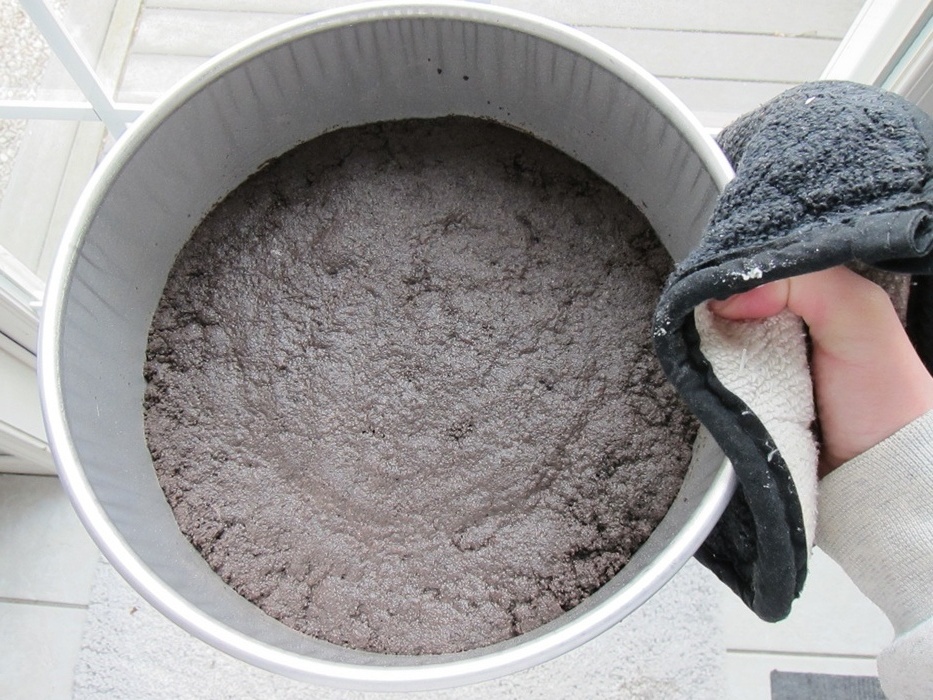 Spread the slightly thawed ice cream in the cake pan and put it in the freezer. Using the bottom of a glass or small dish is again a good way to smooth it out. When the ice cream has frozen for at least an hour and when the cake is room temperature, you’re ready to put things together.