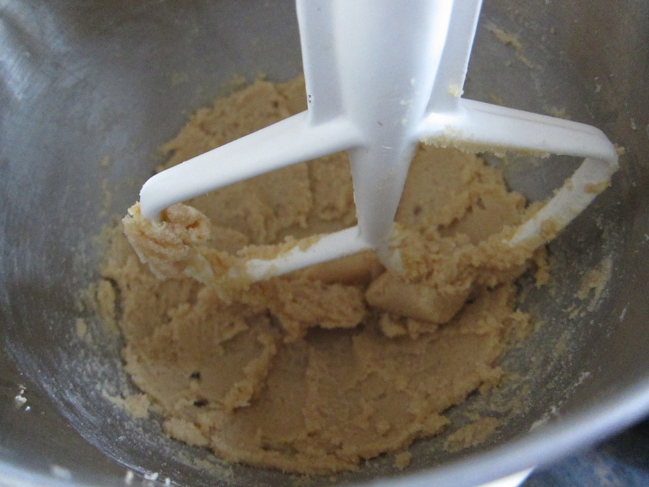 While the crust is baking and cooling, combine the flour, baking soda, and salt for the cookie in a bowl and set aside. Cream the stick of butter with the sugars and vanilla until light and fluffy.