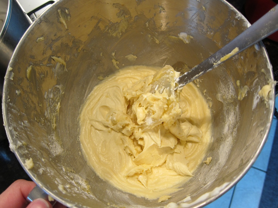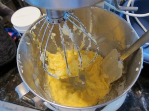 In another bowl, beat the room temperature butter on high speed until light and creamy. Beat in the vanilla, then gradually add the sugar, beating until again light and creamy. Add the yolks and beat another minute or two, scraping the sides of the bowl.