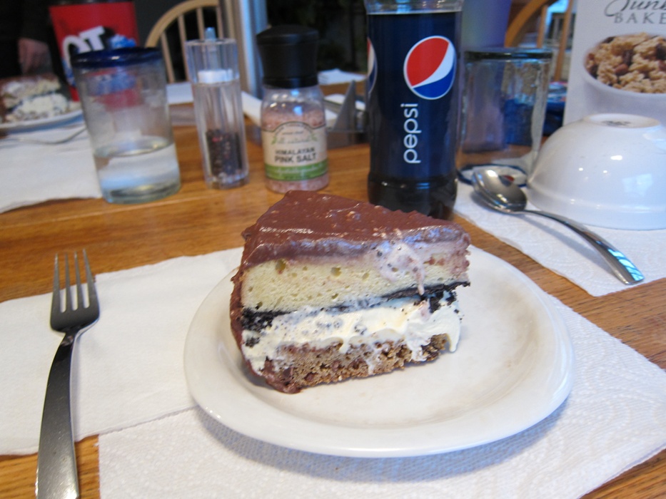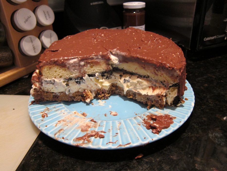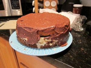 This time I made every thing from scratch, and addressed an issue my friend Catie has with ice cream cakes, that the ice cream melts and makes the cake soggy. She had mentioned, in the same conversation that she told me she doesn’t like ice cream cakes, that a friend of hers had said something about baking cakes with crusts, which I jumped on and put an Oreo crust on the cake layer. It worked really well at keeping the ice cream out of the cake, and was one more good flavor in the mix.
