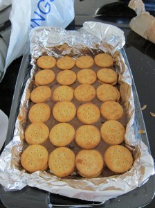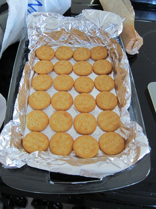 Line a 9×13 inch pan with parchment or non-stick foil. I think foil works a bit better for this because you can shape it and have it stay in place. Put a layer of Ritz crackers across the bottom and set aside.