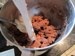With the mixer on low, add the chocolate chips. Add the Oreo filling and stir very briefly, just until it’s stirred in, but while big chunks still remain.
