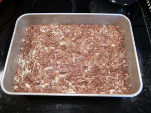Spread into the prepared pan. Again, it may seem like it’s not going to work, this time because it seems like there’s not enough dough to cover, but if you use the flat bottom of a glass or small dish, you can evenly spread the dough out and completely cover the bottom of the dish.