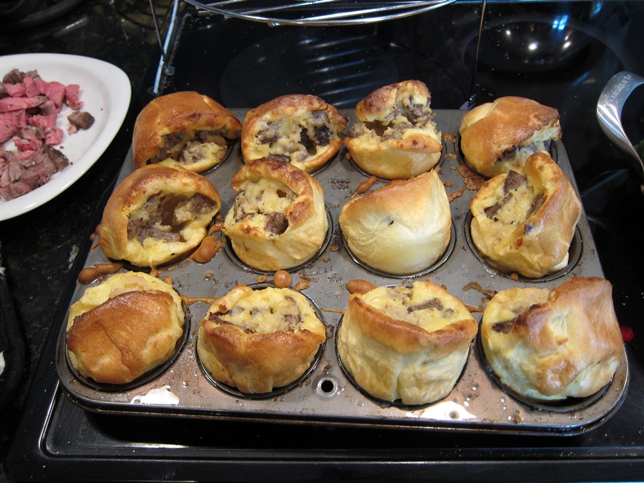 This is a pretty easy dinner, and a good way to use up leftovers if you ever try making prime rib (which also turns out to be super easy). They grow super tall in the oven, but deflate a fair amount if not eaten pretty fast.