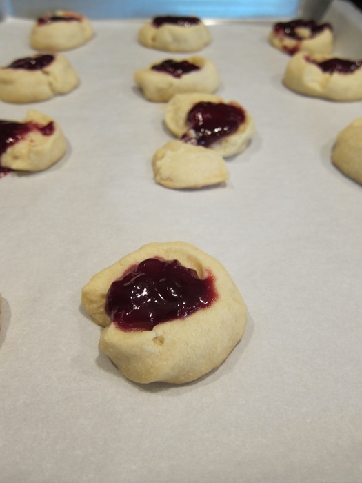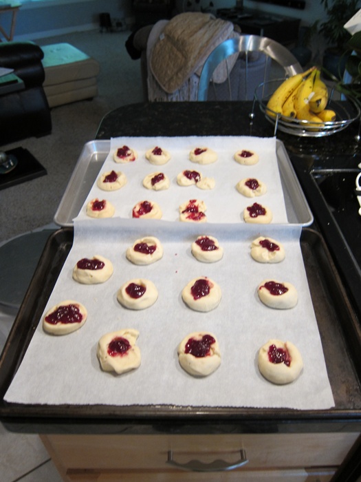 These’re some shortbread-y thumbprint cookies with your favorite flavor of preserves/jam. They went over really well with my floor hockey team, who have noted that we had won the two games that I had brought snacks to at that point and decided that dessert is our good luck charm.