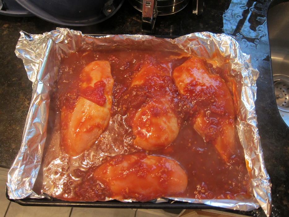 Put the chicken in the lined pan and pour the sauce on top. Bake until cooked through, about 20 minutes. Turn on the broil and cook another two minutes.