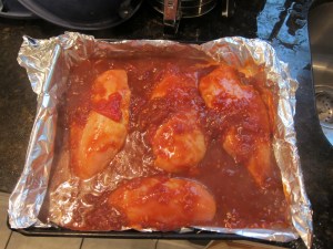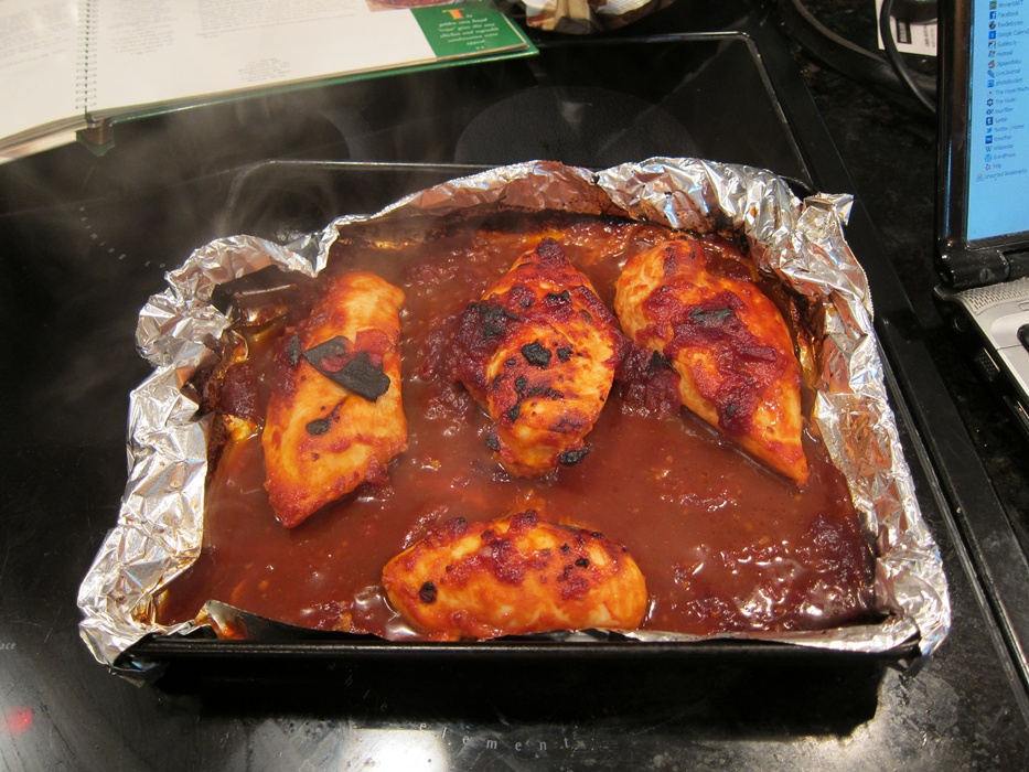 This recipe’s adapted from a book of healthy chicken recipes, so for once I am reasonably sure something I’m posting isn’t awful for you. Exciting? It’s a somewhat sweet barbecue sauce, and I liked it a bunch. It’s great with some corn and maybe a chunk of bread.