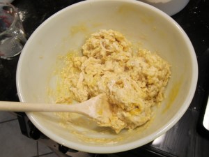 Add the sugar, eggs, and salt, and stir together.