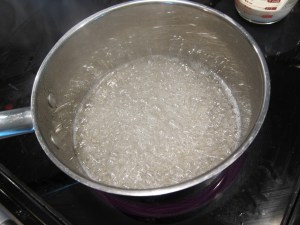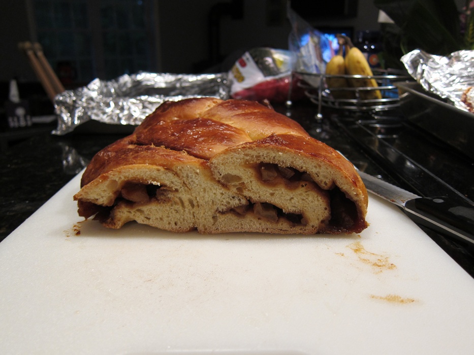 Happy Memorial Day! May’s Daring Bakers’ Challenge was pretty twisted – Ruth from The Crafts of Mommyhood challenged us to make challah! Using recipes from all over, and tips from “A Taste of Challah,” by Tamar Ansh, she encouraged us to bake beautifully braided breads. I had some sourdough starter that I’d been neglecting and my mom wanted me to do something with, and I’d seen a caramel apple challah sourdough recipe, so I knew what I had to do. Unfortunately, I didn’t have enough eggs in the house for any of the sourdough challah recipes I saw, so I sort of…made my own? It came out pretty good, especially for an experiment, although I wish I’d cooked the caramel of the filling a few seconds less.