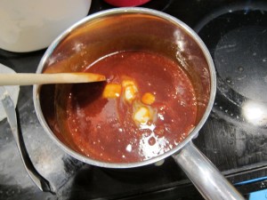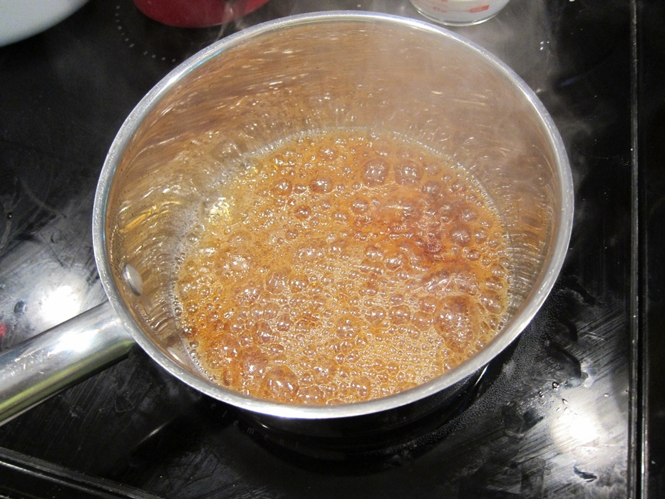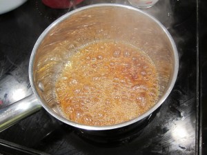 When medium brown, lower the heat and gradually add the cream and butter, being careful of spattering sugar.