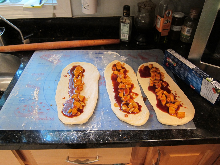 When the apples are cooled and the dough has risen, divide the dough into three portions. Roll out into roughly 1/2″ thick ovals and spoon some of the apple mixture down each piece.