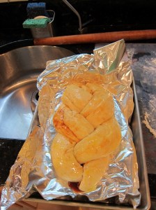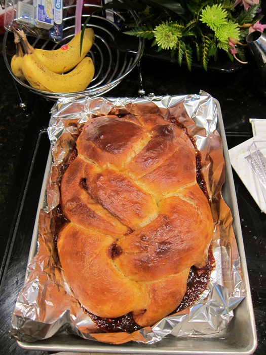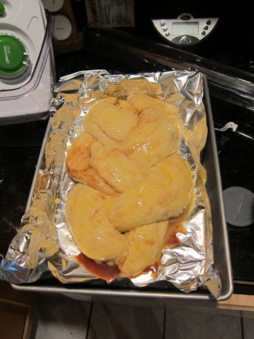 Braid the three ropes together, then transfer to a foil-lined baking pan. I used a 9X13″ dish, as this had to fit in the oven with a few other things, and a cookie sheet wouldn’t’ve cut it. Brush with the egg/water mixture.