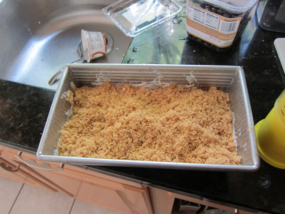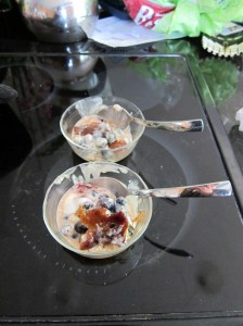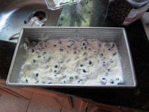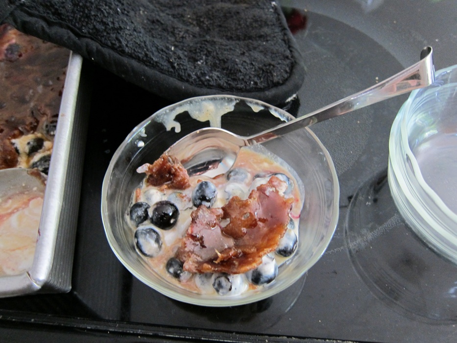 Turn on your oven’s broiler. Gently fold the berries into the yogurt in a one quart (or roughly similar sized) broiler-safe dish. I used a metal bread pan, because I knew it wouldn’t shatter under the broiler.