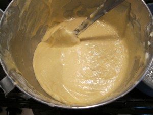 Add the egg mixture in three additions, beating well and scraping down the bowl after each addition.