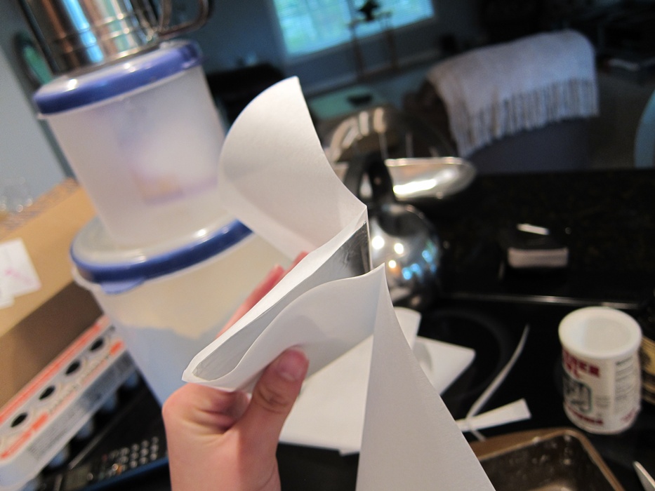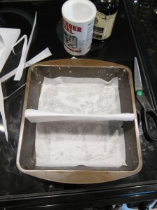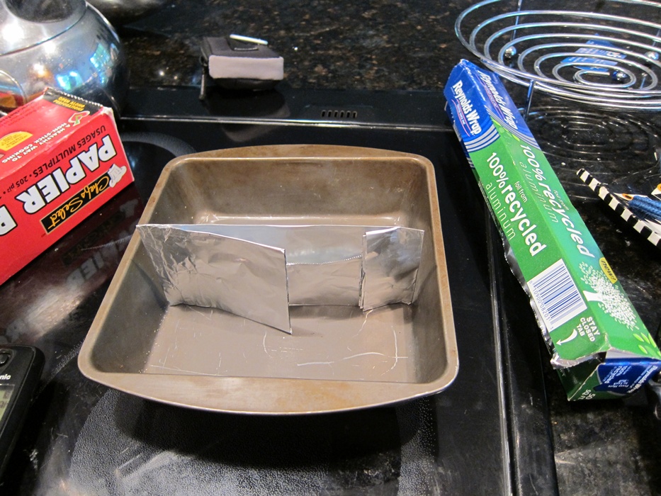 The first thing to do, if you don’t have a pan specifically for making this cake, is to set up your pan. Fold a piece of foil so that it’s several layers thick, 2-3 inches tall, and wide enough to divide an 8X8″ square pan.
