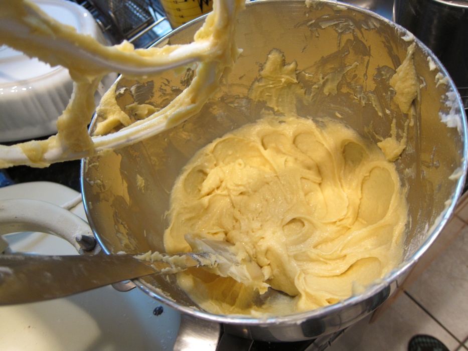 In a large bowl, beat the butter until smooth and shiny. Beat in the powdered sugar in 3 additions, beating after each. Add the egg mixture in three batches next, again beating after each. Add the flour mixture and beat until just combined.