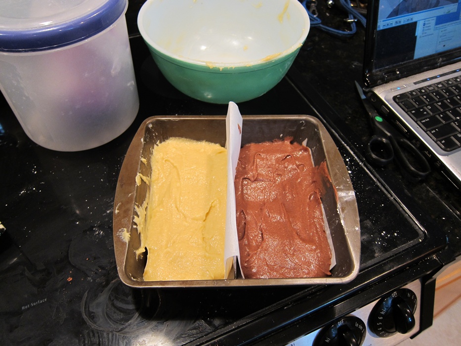 Divide the batter as evenly as you can into two bowls. Transfer two tablespoons of batter from one bowl to the other. Beat the cocoa mixture into the bowl with the slightly less batter.
