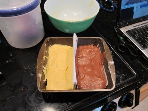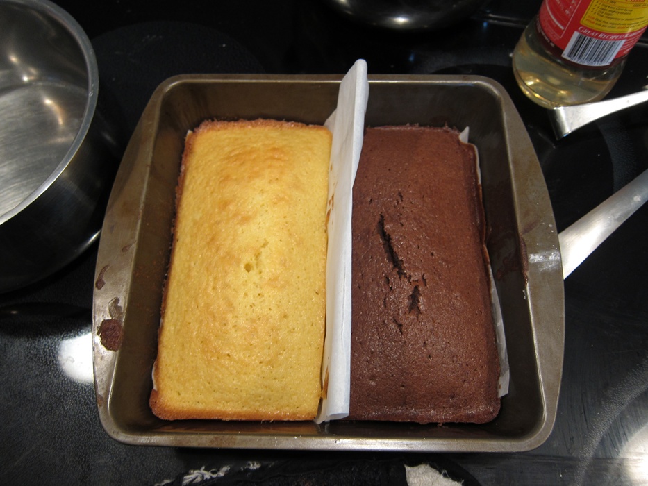 Spread the two batters in the cake pan, one on each side of the divider, spooning the batter slightly higher at the ends. Bake 25 – 30 minutes, until a toothpick inserted in the center comes out clean. Let cool in the pan for 10 minutes, then remove to a wire rack to cool completely.