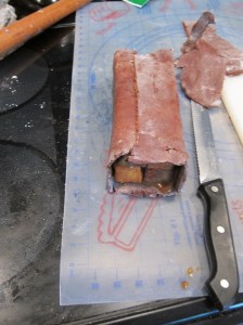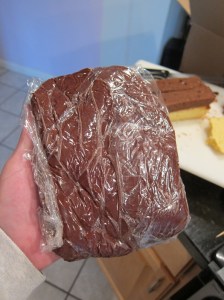 Set the cake aside and take out the chocolate plastique. Knead until pliable, then roll out to about 1/8″ thick. “Flour” with powdered sugar as necessary. Roll until it’s as wide as the cakes are long, and long enough to wrap around the cakes.