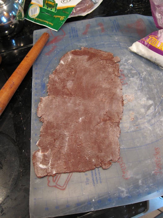 Set the cake aside and take out the chocolate plastique. Knead until pliable, then roll out to about 1/8″ thick. “Flour” with powdered sugar as necessary. Mine never got super pliable, but I beat it into submission with a rolling pin.