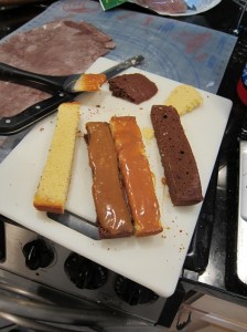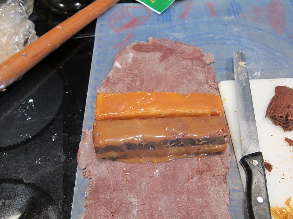 Place the alternate flavor cake slice on top of each, then coat the sides where the two stacks touch each other with caramel sauce. Coat all the outside surfaces with caramel sauce also, then place top-side down on the rolled out chocolate.